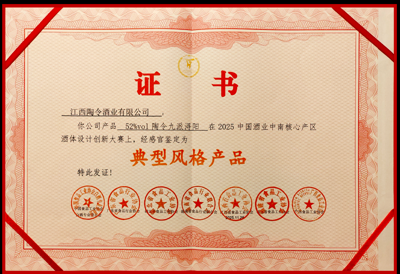 11月26日至28日,2025中国酒业中南核心产区酒体设计创新大赛在广东盛大举办。作为江西白酒行业的杰出代表,陶令酒业旗下两大核心产品——“52%vol陶令九派浔阳”与“52%vol陶令老窖”,凭借卓越品质与鲜明特色,从众多参赛酒品中脱颖而出,分别斩获“典型风格产品”与“地域标志产品”两大奖项。两大主打产品同时斩获佳绩,不仅充分印证了陶令酒业在酒体设计方面的雄厚实力,也集中展现了陶令品牌在中南核心产区中突出的品质水准与创新活力。